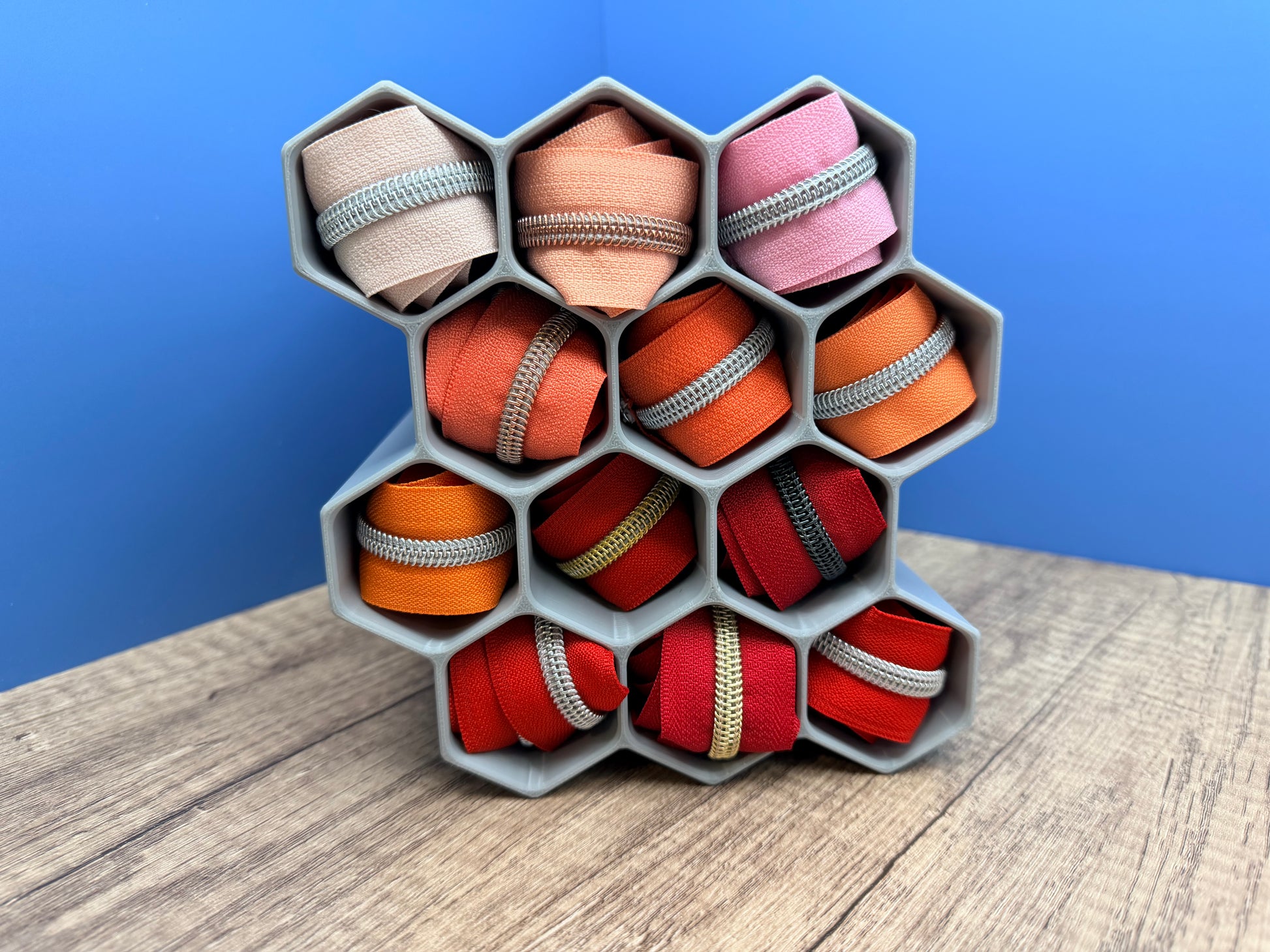 The Zipper Hive is a practical storage solution designed for sewers and crafters who want to keep their zipper collection organized and visible. With 12 dedicated storage slots, it accommodates up to 3 yards of zipper tape per unit, allowing you to display the vibrant colors and patterns of your collection at a glance. The compact design stacks seamlessly when you purchase multiple units, making it easy to expand your storage as your zipper inventory grows. Perfect for studios, craft rooms, or anywhere you need quick access to quality zippers without the clutter.